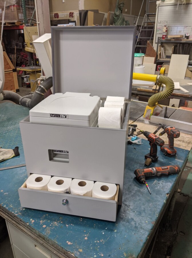 Rhino Toilet Cabinets are a convenient way to stow your portable toilet. They are sturdy and can be used as a spare seat as well. They come in standard Westy colors, but if you would like a special finish, please email Rhino Design for a quote. Turn-around time is usually two weeks. Fits Thetford PortaPotti 260B(discontinued) and the 135. Inside is 15.3/4″d x 14’w x 13″h. Footprint 18″d x15 1/2″w x 15 1/2″h. Custom sizes and finishes are available on order.